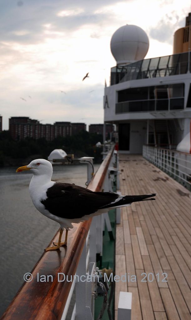 I was awoken by an alarm call I didn’t request at 7.45am. We were still sailing into port so I took a few shots of the view – including a seagull which was happily perched on the hand rail.