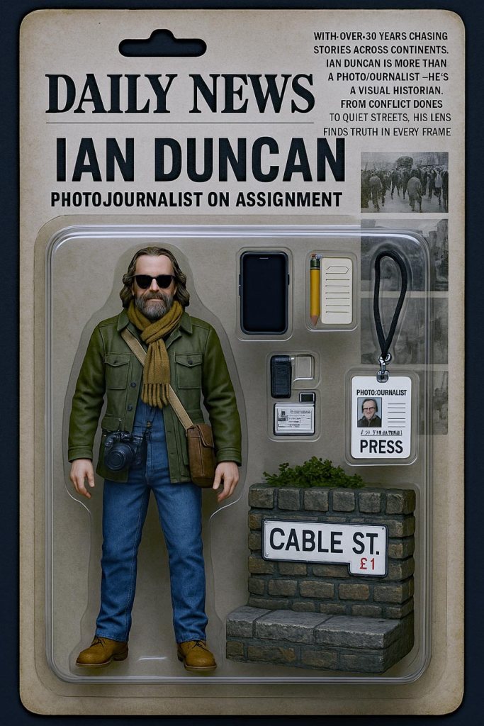 Having said that I am quite impressed with the results of my dabbling with Chat GBT which used this shot of me in Cable Street which was he scene of a famous battle where the locals stood up against Mosely’s supporters.