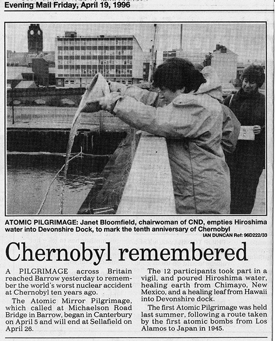 We all know the aftermath but fast forward to almost 10 years later and I photographed the Atomic Mirror Pilgrimage in April 1996 for the North West Evening Mail where a total of 12 participants took part in a vigil and and poured Hiroshima water into Devonshire Dock in Barrow-in-Furness in south Cumbria before finishing at Sellafield on the 10th anniversary.